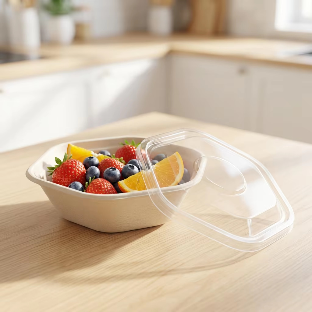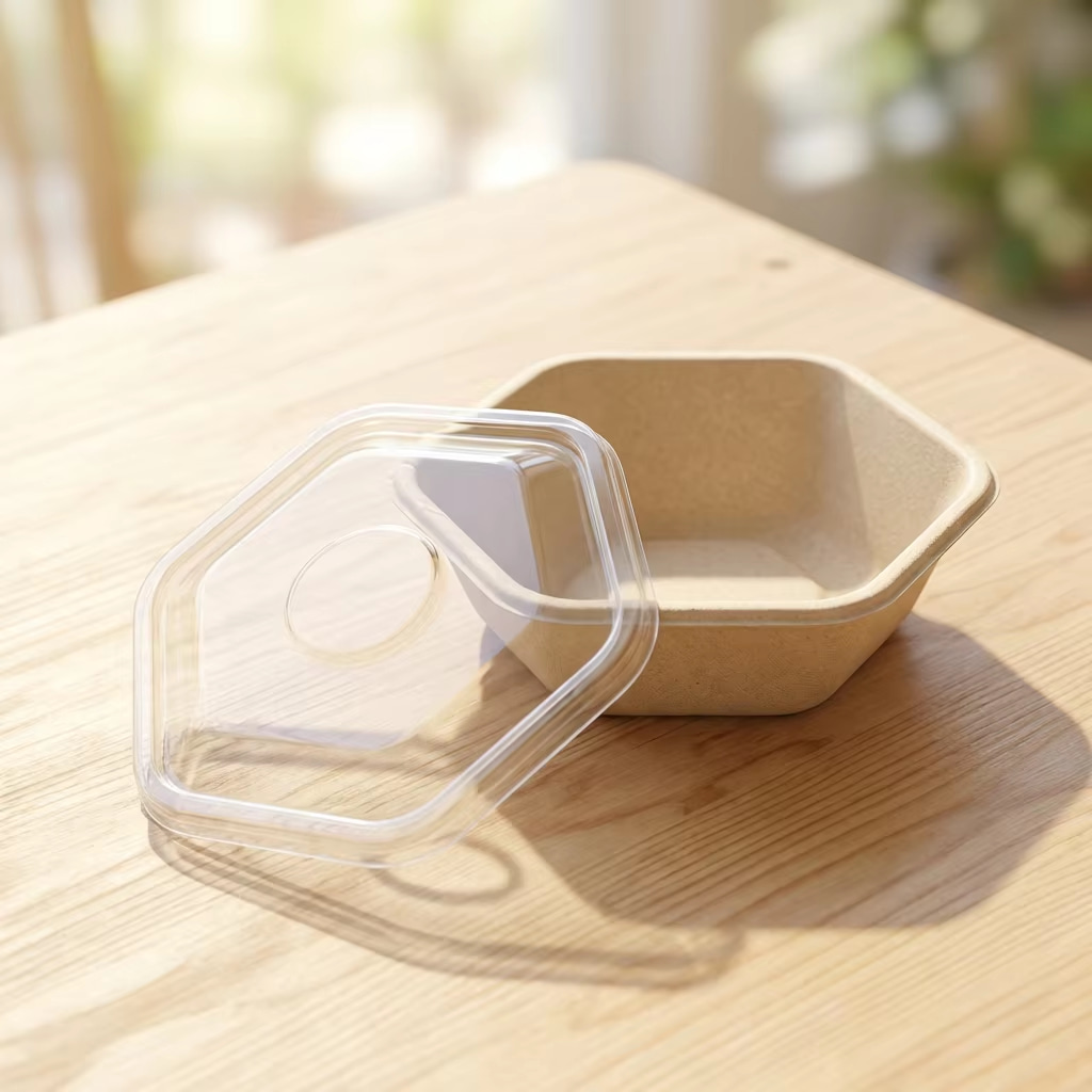 Tapa de plástico PET transparente para recipiente hexagonal de bagazo de caña de azúcar de 750 ml